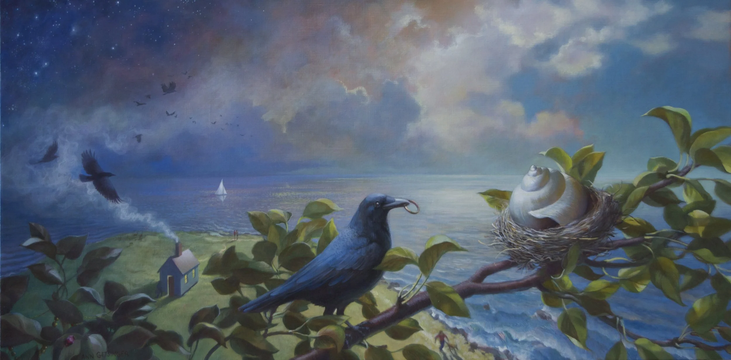 “…Primavera is a masterclass in ephemerality, so exquisitely rendered is the soft opalescence of the shell, the gauzy translucency of the drapery, the smoky atmosphere of the horizon. Yet there is also a compellingly physical side to the work. Unexpected areas of gritty impasto emerge from the rocky shoreline, grounding the viewer in Getsinger’s ethereal dreamscape.” —Cara Wolahan, MFA